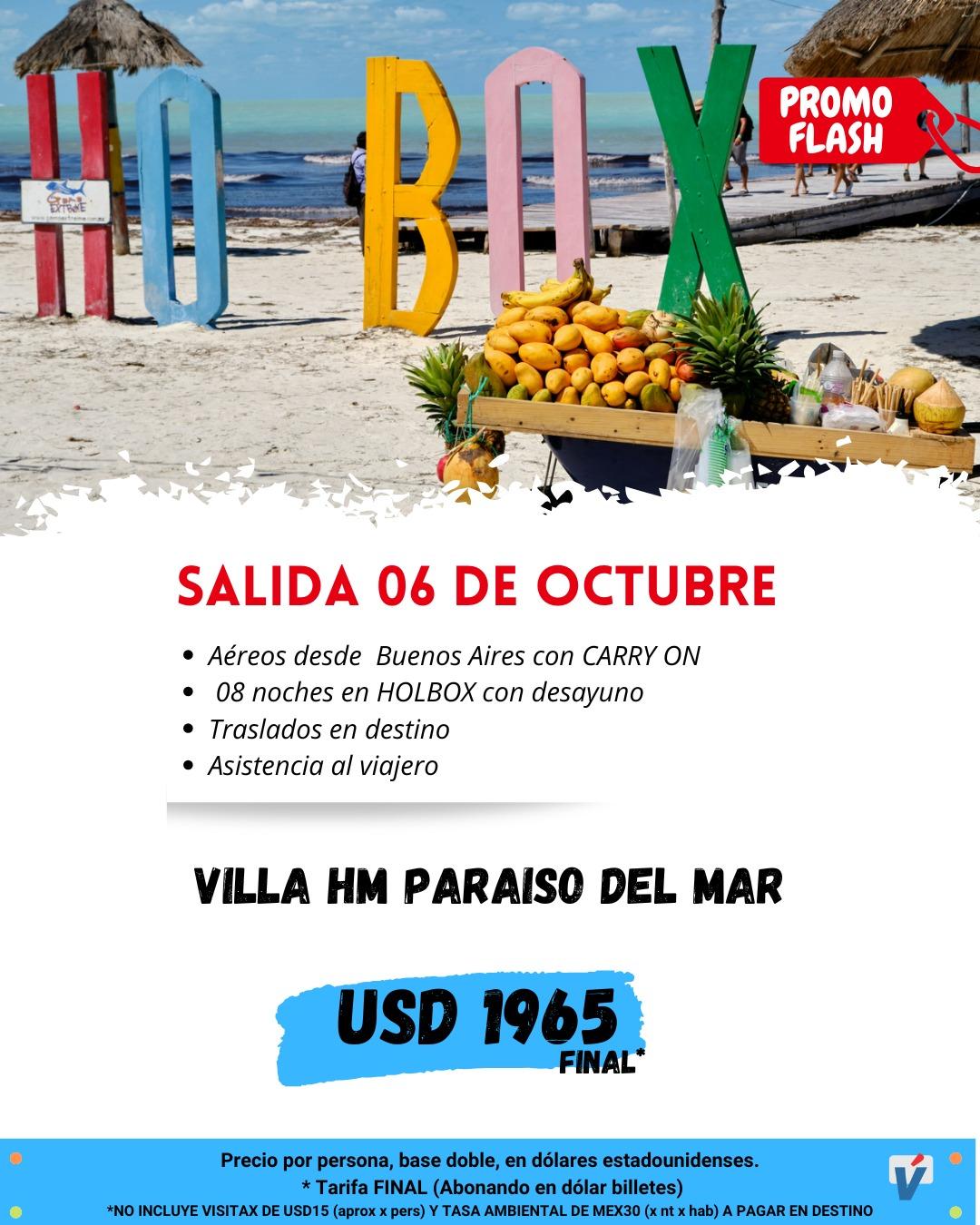 Este paquete incluye vuelos desde Buenos Aires con CARRY ON, 8 noches en Holbox con desayuno, traslados en destino y asistencia al viajero. Disfruta de la belleza de la paraíso en Villa HM, en la playa de Holbox, con un precio final de USD 1965.